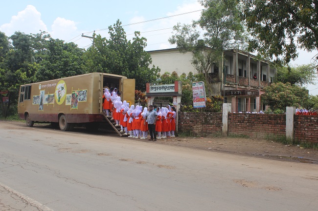 visited by children from nearby schools, which were not part of the education program and also by the adults in that village. Till August 2021, around 9,43,881 adults from the localities have visited the exhibits of the bus in this way. The Bangladesh Government has been impressed enough by the success of this Reach-Out Program to have donated a second bus to the Museum, thus doubling the museum’s capacity to visit rural areas. The buses have covered 432 Upazillas of 64 districts of the country including 2,035 educational institutions and are currently conducting the 2nd round of covering the whole country.